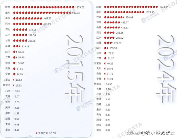 2024年,我國蘋果產(chǎn)量排名前三的省域依次為陜西、山東、甘肅;