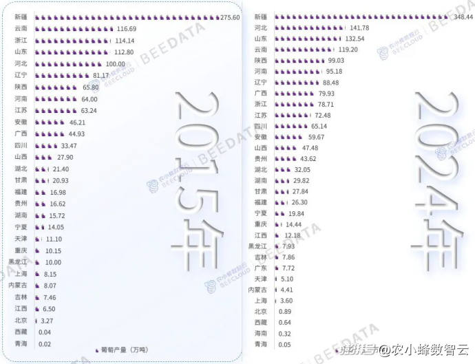 圖表9:中國各省域葡萄產(chǎn)量排名(2024年VS2015年)