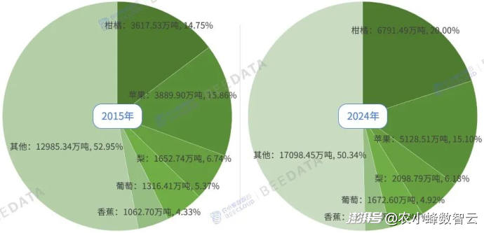 2. 2024年,中國果園面積為1.91億畝、生產(chǎn)水果3.4億噸;主要生產(chǎn)柑橘(20%)、蘋果(15.1%)、梨(6.18%)、葡萄(4.92%)、香蕉(3.46%)等水果品種。與2015年相比,中國果園面積增長了0.23億畝,增幅約為13.47%,年均復(fù)合增長率約為1.41%;水果產(chǎn)量增長了0.95億噸,增幅約為38.5%,年均復(fù)合增長率約為3.68%;各主要水果品種產(chǎn)量均有所增長,但僅柑橘產(chǎn)量在全國水果產(chǎn)量中所占的比重呈增長趨勢(shì)。
