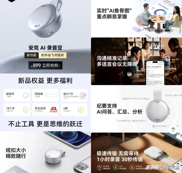 在這個(gè)共同的戰(zhàn)略意圖下,一是可以彌補(bǔ)純軟件無(wú)法完美覆蓋的線下場(chǎng)景(如遠(yuǎn)場(chǎng)拾音、無(wú)感記錄),二是能爭(zhēng)奪高價(jià)值的商業(yè)數(shù)據(jù)(尤其是非結(jié)構(gòu)化的會(huì)議錄音數(shù)據(jù),用于反哺自身AI模型)。