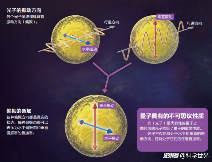 實驗結果是,有一半強度的光通過,而且過去的光就變成了45度方向的偏振,不再是0度方向了。45度方向的偏振片對0度方向的光子是中等程度的阻礙,介于0度的沒有阻礙和90度的最大阻礙之間。但請再仔細想想,所謂“光的強度降低一半”是對大量光子集體的描述,如果我們只關注一個光子呢?