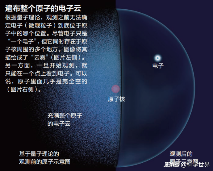我們在高中時可能就聽說過電子云這個詞,最初接觸的時候可能會覺得就是電子運動得太快了看不清它在哪兒,但現(xiàn)在大家可以明白了,不是因為跑得太快看不清,而是因為電子的位置在本質上就是不確定的,在測量的一瞬間才會落到某個確定的位置。