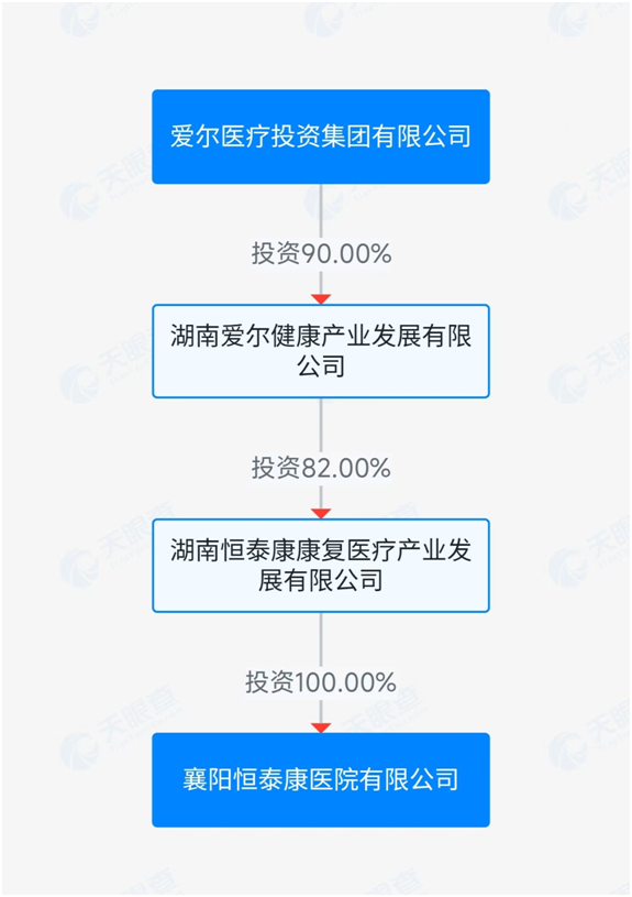 天眼查信息顯示,襄陽恒泰康為愛爾醫(yī)療旗下成員之一,愛爾醫(yī)療對襄陽恒泰康存在間接控股。具體來看,襄陽恒泰康由湖南恒泰康康復(fù)醫(yī)療產(chǎn)業(yè)發(fā)展有限公司100%控股;而湖南愛爾健康產(chǎn)業(yè)發(fā)展有限公司又持有湖南恒泰康康復(fù)醫(yī)療產(chǎn)業(yè)發(fā)展有限公司81.9978%的股權(quán);最終,愛爾醫(yī)療通過持有湖南愛爾健康產(chǎn)業(yè)發(fā)展有限公司90%的股權(quán),實現(xiàn)了對襄陽恒泰康的間接控股。
