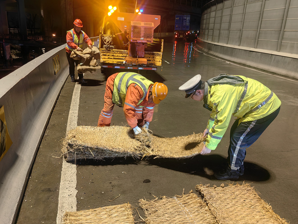 寶山支隊(duì)高速大隊(duì)民警正在轄區(qū)城市快速路易結(jié)冰點(diǎn)鋪設(shè)草墊 上海市公安局 供圖