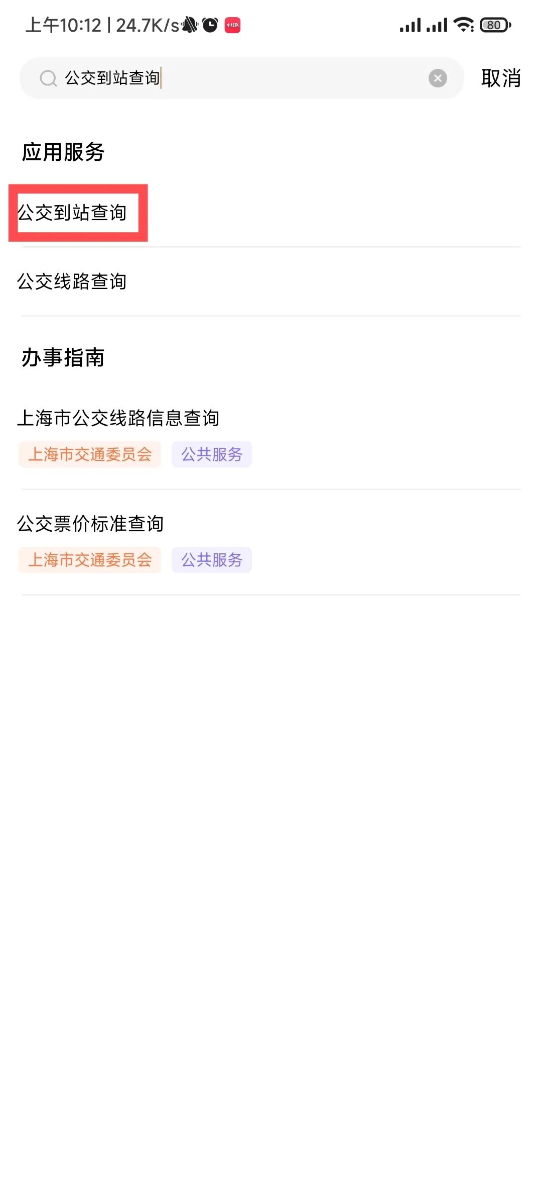 打開“隨申辦市民云”APP首頁搜索點(diǎn)擊【公交到站查詢】,即可進(jìn)入服務(wù)。