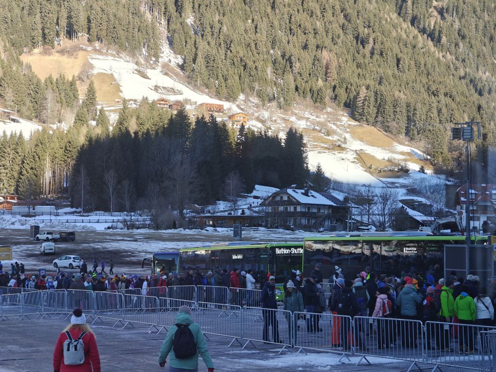 更深層的原因,在于地形本身的限制。安泰塞爾瓦冬季兩項(xiàng)競(jìng)技場(chǎng)位于海拔1600米以上的山谷盡頭,道路狹窄、承載能力有限。冬奧會(huì)期間,當(dāng)?shù)貙?shí)施三層交通限制區(qū)管理,所有車(chē)輛須持通行證進(jìn)入核心區(qū)域。絕大多數(shù)觀眾要先乘坐火車(chē)或公交到達(dá)指定換乘點(diǎn),再排隊(duì)搭乘接駁車(chē)上山。