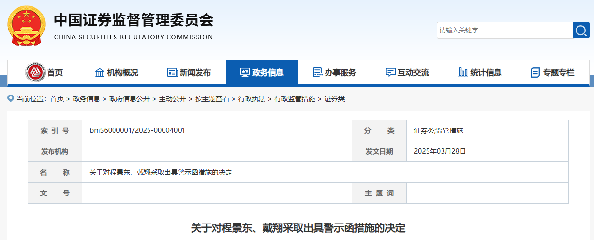 “程景東作為分管投行業(yè)務(wù)高管,戴翔作為投行質(zhì)控部總經(jīng)理,對上述問題負(fù)有責(zé)任。按照《證券發(fā)行上市保薦業(yè)務(wù)管理辦法》第六十四條的規(guī)定,我會決定對你們采取出具警示函的行政監(jiān)督管理措施。”證監(jiān)會表示。