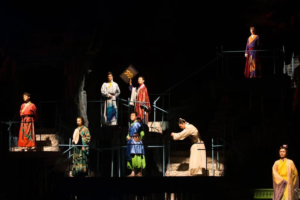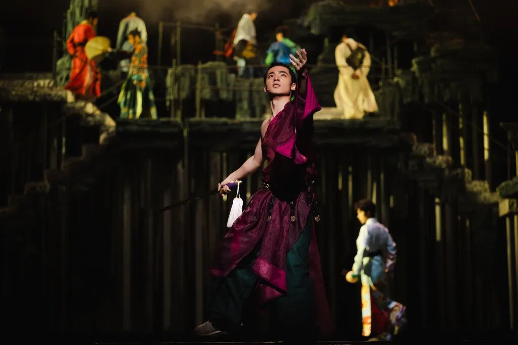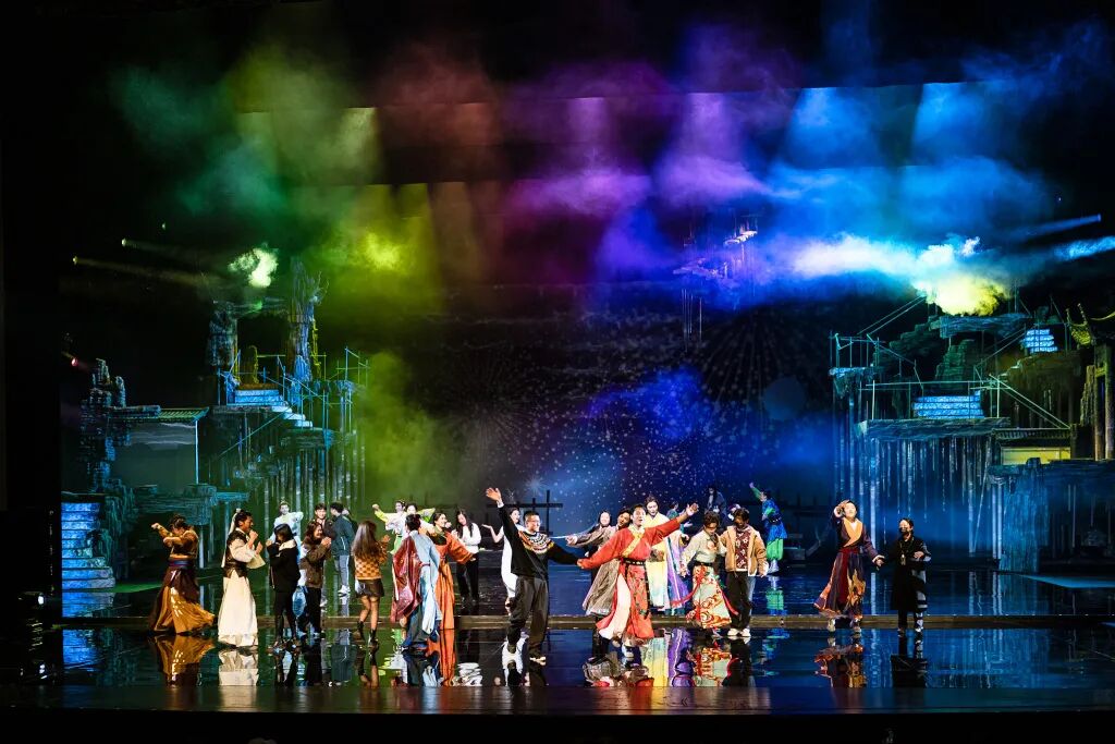 舞臺(tái)視覺的構(gòu)建自然要服務(wù)于這種“情緒價(jià)值”的輸送。整場(chǎng)演出的信息密度極高,用毛時(shí)安的話說,是以“二倍速、2.5倍速在穿插”。歷史人物如星辰般模塊化登場(chǎng)、閃回、交織,時(shí)空在瞬間切換。一條象征“中華文明延續(xù)”的“無限延伸的路”則貫穿舞臺(tái),它既是地理意義上的水路、山路,更是每個(gè)人物畢生探尋的“人生之路”。