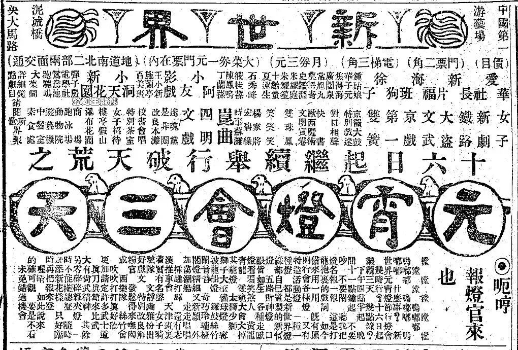 圖為1920年3月6日《申報(bào)》刊登的新世界元宵燈會(huì)廣告