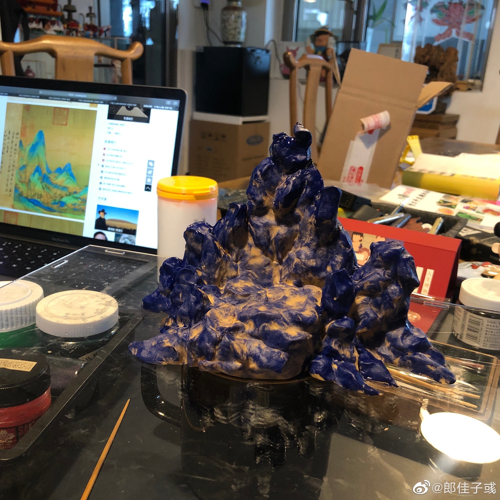“左右兩邊是火神和雷神,代表著當(dāng)時的火神山和雷神山兩個防疫醫(yī)院,中間站著的就是鐘南山院士。三個人物形成一個山字形,周圍的山水都是我從《千里江山圖》里挑選的配色和造型,想表達就是‘雷神、火神和鐘南山守護著千里江山’的感覺。 ”
