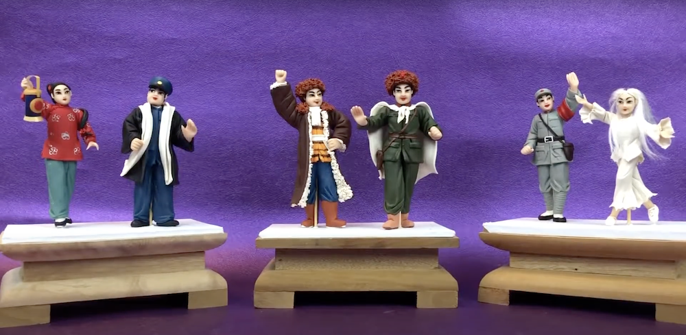 第二代“面人郎”郎志春創(chuàng)作的“樣板戲”面人作品?!睹嫒死傻闹袊适隆?視頻截圖