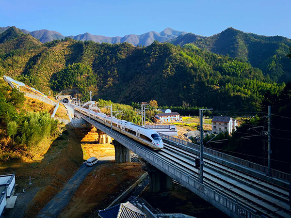 一列高鐵列車(chē)在杭黃高鐵線上飛馳。本文圖片 中國(guó)鐵路上海局集團(tuán)有限公司提供