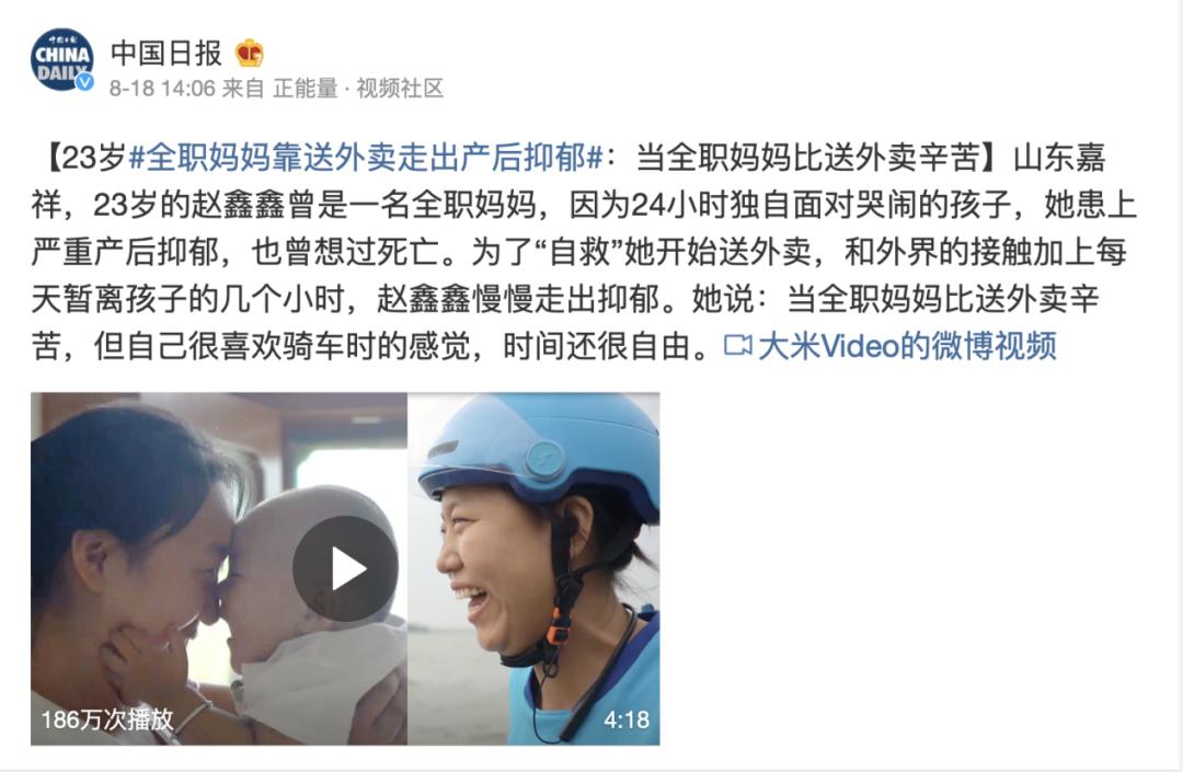 幾個月前,就有新聞報道,一位23歲的全職媽媽因24小時獨自面對哭鬧的孩子患上嚴重產(chǎn)后抑郁,也曾想過死亡。為了“自救”,她開始送外賣,和外界的接觸加上每天暫離孩子的幾個小時,讓這位年輕媽媽慢慢走出抑郁。