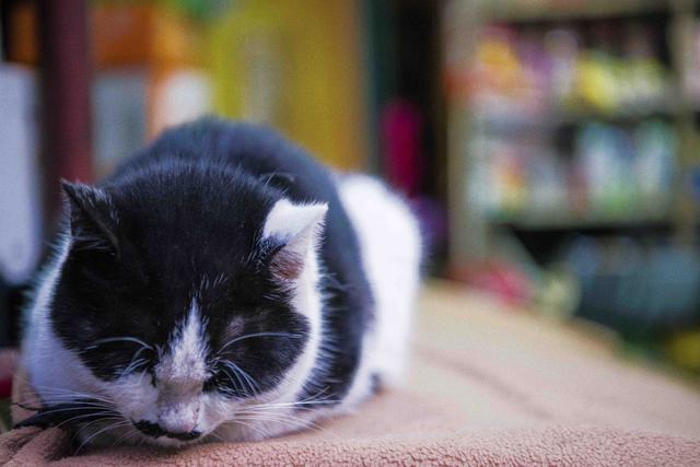 從利濟(jì)路拐入長(zhǎng)堤街東段不遠(yuǎn),一家食雜店柜臺(tái)上的貓咪,看主顧不多,便開(kāi)始打起盹來(lái)。攝影/黃華