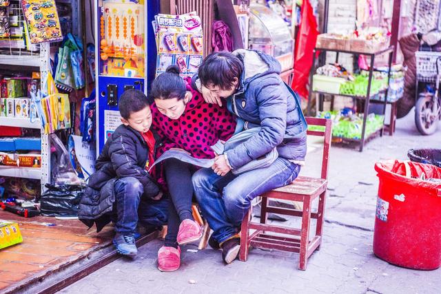 在廣貨巷西側(cè)一家店鋪門(mén)口,孩子剛放學(xué)回家,經(jīng)營(yíng)店鋪的父母與孩子一起做起家庭作業(yè)來(lái)。攝影/黃華