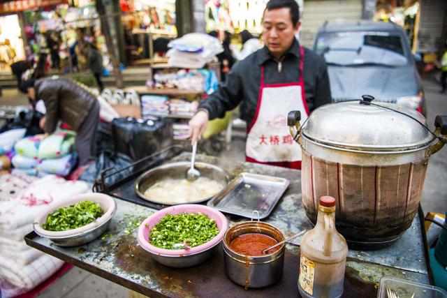 在廣貨巷街上,這個(gè)流動(dòng)小吃攤出來(lái)做生意了。到了晚上,廣貨巷與相連的大夾街西段一起成了熱鬧的夜市。攝影/黃華