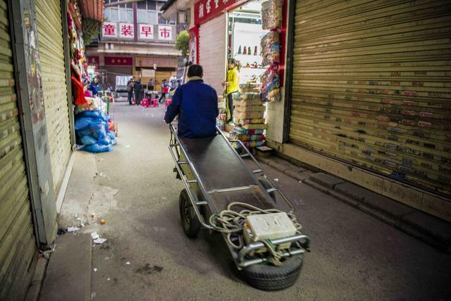 在廣貨巷南端東側(cè)的商貿(mào)市場(chǎng)一層廊道下,一位運(yùn)輸工坐著他的電動(dòng)板車(chē)準(zhǔn)備收工回家了。攝影/黃華