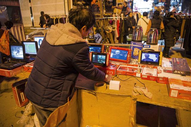 過(guò)了晚上6點(diǎn)左右,多福路以西,大夾街和廣貨巷開(kāi)始成為夜市。這是多福路與大夾街交叉口,一位攤販在整理待售的老年人微型電視。攝影/黃華