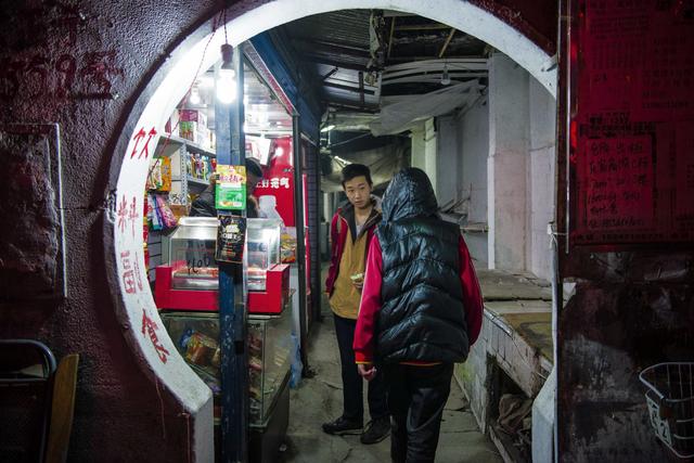 從大夾街西段過(guò)三曙街,利濟(jì)路,再向西進(jìn)入漢正街。與明亮的利濟(jì)路東側(cè)的漢正街比,漢正街市場(chǎng)西門(mén)以西的漢正街一到晚上黑漆漆的。這是一個(gè)小區(qū)胡同內(nèi)的小賣(mài)部前,來(lái)了兩位學(xué)生主顧。攝影/黃華